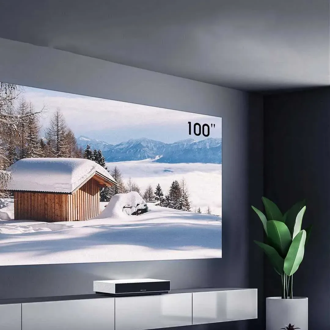 The 0.23:1 large scene depth ultra short focus lens is designed and placed on the TV cabinet. It can project a super large picture of 100 inches at a distance of 24 cm from the wall. There is no worry about hoisting and wiring, and it does not occupy the room, and the farewell picture is blocked